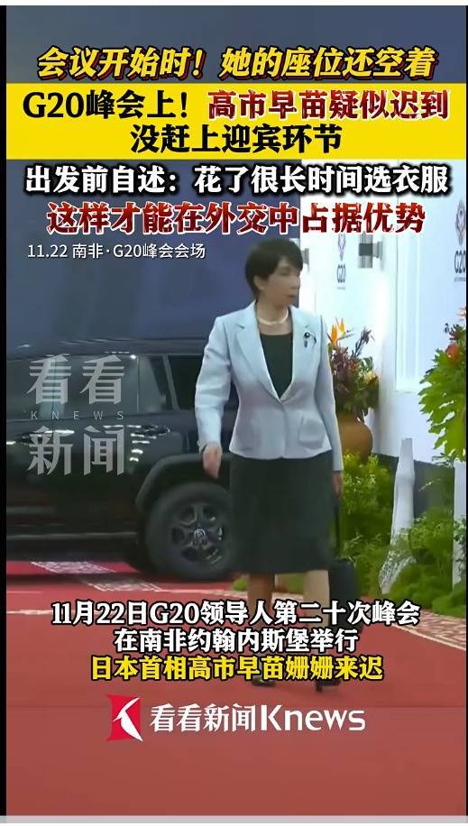 据环球网报道,11月22日,日本首相高市早苗被曝在G20领导人南非峰会开始约一小时后才抵达会场就座。高市早苗在另一位领导人发言过程中进入会场。在入座前,她与印尼副总统拉卡快速握手致意。稍早前报道,在各国领导人入场时并未看到高市早苗,会议开始时她的座位是空着的。